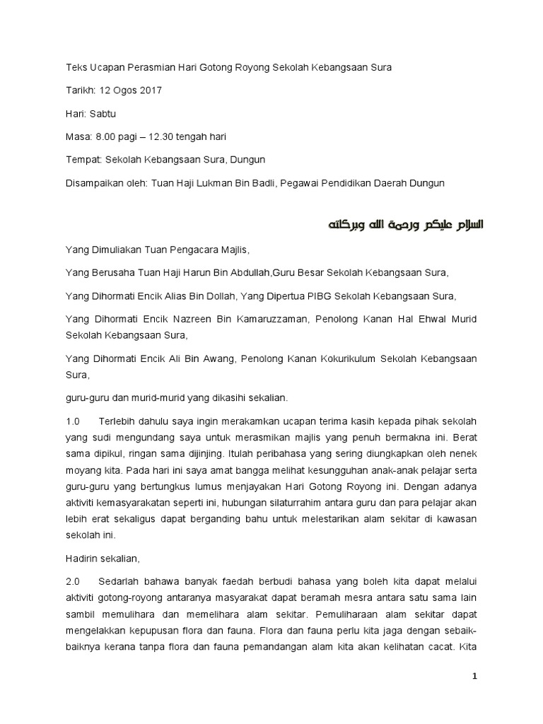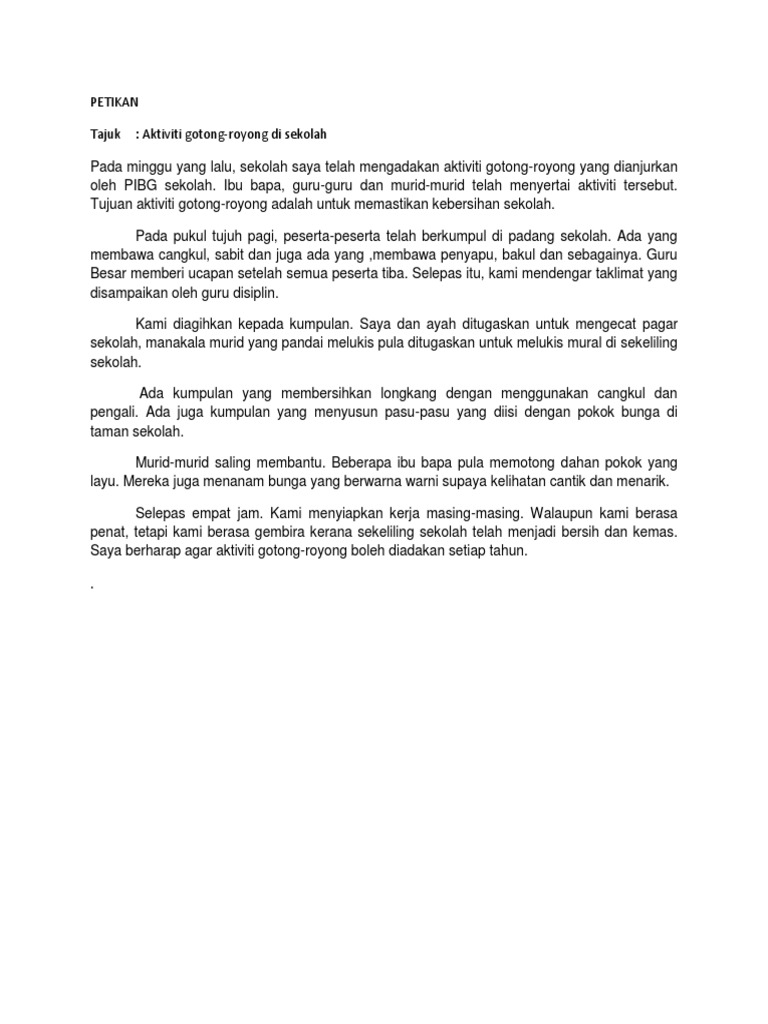 Sebelum saya mengakhiri ucapan ini saya sekali lagi ingin mengucapkan ribuan tahniah kepada jawatankuasa penganjur kerana berjaya mengadakan Hari Gotong-Royong Sekolah yang sangat bermanfaat ini. 31 Full PDFs related to this paper. Pada hari Ahad yang lalu sekolah saya mengadakan aktiviti gotong-royong Pada pukul lapan pagi kami berkumpul di padang Aktiviti ini adalah untuk membersihkan kawasan sekolah Kami membawa peralatan Guru besar memberi ucapan di atas pentas Kami dibahagikan kepada tiga kumpulan Kumpulan A.